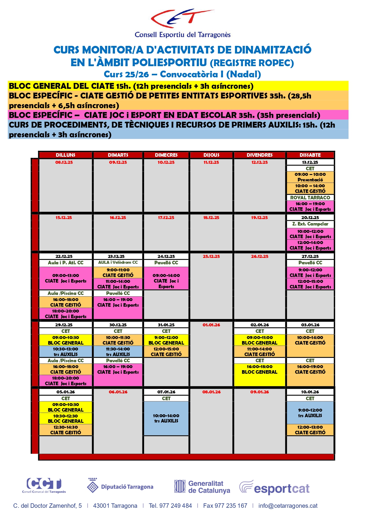 HORARI BLOC ESPECÍFIC CIATE JOC I ESPORT EN EDAT ESCOLAR Nadal 2025-26