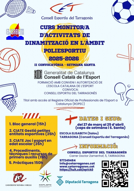 El Consell Esportiu del Tarragonès, amb conveni i l’autorització de l’Escola Catalana de l'Esport i amb el suport de l'Escola Elisabeth de Salou, convoca un nou CURS DE MONITOR/A D’ACTIVITATS DE DINAMITZACIÓ EN L’ÀMBIT POLIESPORTIU, amb els seus quatre blocs preceptius; formació que faculta als alumnes que es puguin donar-se d’alta al REGISTRE OFICIAL DE PROFESSIONALS DE L’ESPORT DE CATALUNYA (ROPEC).