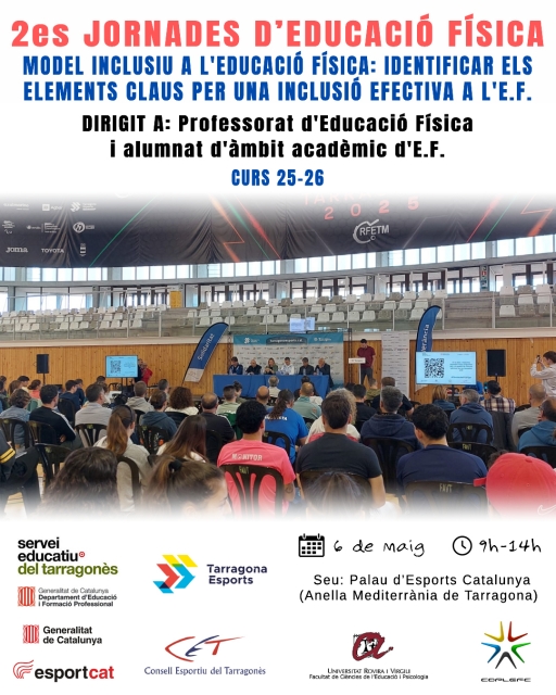 Les 2es Jornades d’Educació Física tindran lloc el proper dimecres 6 de maig de 2026 al Palau d’Esports de Catalunya, a l’Anella Mediterrània de Tarragona, en horari de matí. Aquesta edició girarà entorn de la temàtica “Model inclusiu a l’Educació Física. Identificar els elements claus per a una inclusió efectiva”, amb l’objectiu d’oferir eines pràctiques i reflexió pedagògica al voltant de la inclusió en l’àmbit educatiu.