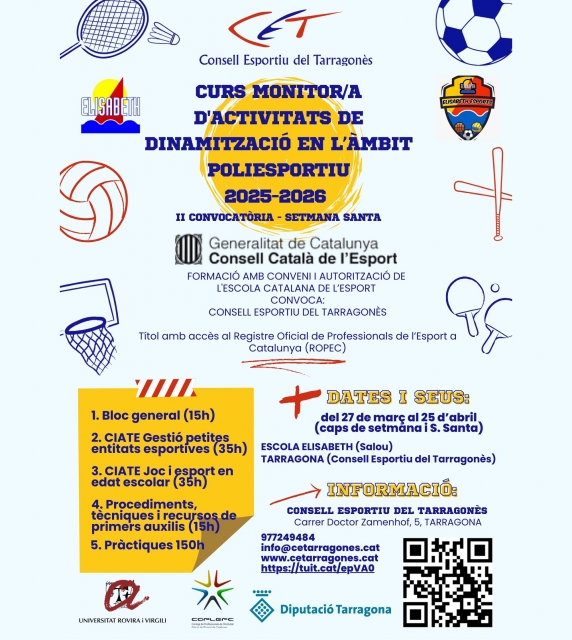 Aquesta cap de setmana va finalitzar una nova edició del CURS DE MONITOR/A D’ACTIVITATS DE DINAMITZACIÓ EN L’ÀMBIT POLIESPORTIU, formació autoritzada per l’Escola Catalana de l’Esport, que faculta els alumnes que puguin donar-se d’alta al Registre Oficial de Professionals de l’Esport de Catalunya (ROPEC). Aquesta edició, amb 14 alumnes participants, s’ha desenvolupat majoritàriament al període de Setmana Santa a l’Escola Elisabeth de Salou i a la nostra pròpia seu, i és ja la dinovena convocatòria que hem organitzat d’aquest format, que es va engegar l’any 2018. Estem treballant ja per les dues properes convocatòries, que se celebraran aquest estiu vinent a la Pobla de Mafumet (matí) i a Tarragona (tarda).